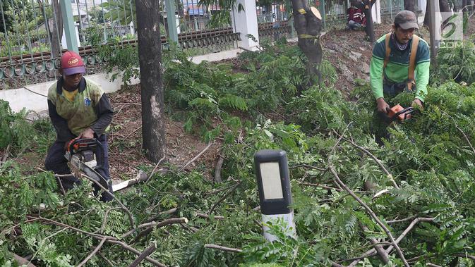 Suasana saat petugas memangkas dahan pohon yang rimbun di sepanjang Jalan Lenteng Agung Raya, Jakarta Selatan, Rabu (2/1). Pemangkasan dilakukan guna mencegah pohon tumbang akibat musim hujan dan angin kencang. (Liputan6.com/Immanuel Antonius)
