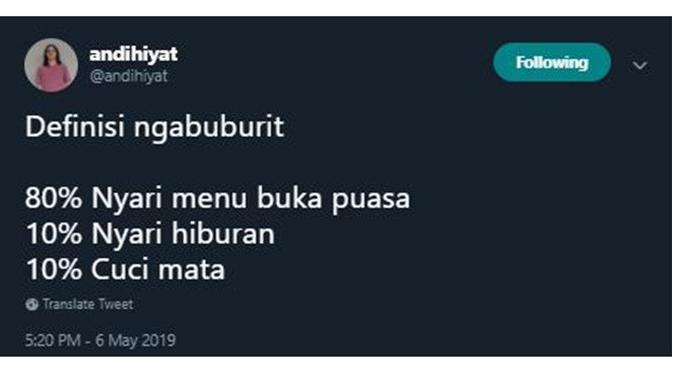 Dilansir dari akun media sosial Twitter oleh Liputan6.com, Senin (6/5/2019) para netizen ramaikan Twitter dengan berdiskusi tentang definisi ngabuburit yang kocak sekaligus nyeleneh. Walaupun neyeleneh, namun beberapa definisi memang kerap dilakukan banyak orang dan benar adanya.