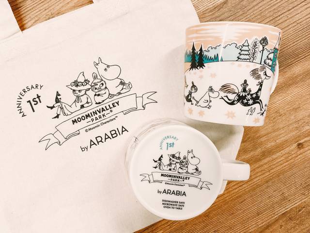 まずは、北欧を代表する食器ブランドARABIA(アラビア)の「ムーミンバレーパーク」限定販売のマグに、1周年限定のバックスタンプをあしらった「ムーミンバレーパーク限定マグ by アラビア」が登場しました。